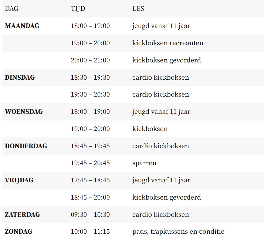 Vanaf 9 januari 2022 gaan we ons rooster uitbreiden. Dit betekent een dubbele cardio les op dinsdag en op zondag een les die in het teken staat van padsen, trapkussens- en conditie.